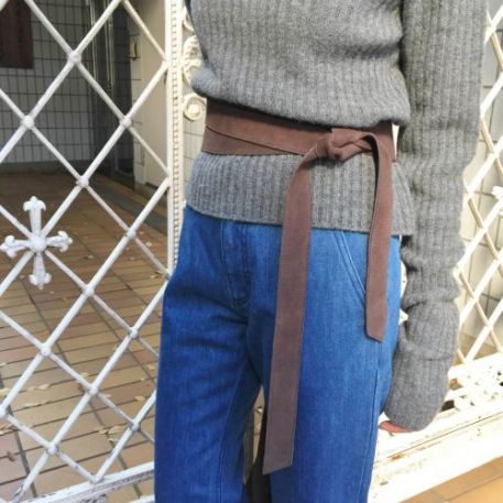 裾を切りっぱなしに処理したデニムパンツがファンを増やしています。気取らない雰囲気が出るうえ、自分でカスタマイズした「DIY」風にも見えるのが切りっぱなしのよさ。こちらはさりげないフレアが利いた大人っぽいシルエット。脚をきれいに見せてくれます。少し短めのレングスに仕立ててあるので、ブーツが程よく主張する仕掛け。足元に視線を引き込んで、着姿を重たく見せません。ニットトップスは袖が長めで今年っぽいのどかなデザイン。あごまで届く襟のおかげで縦長イメージがアップ。オントレンドのサッシュベルトではっきりめにウエストマークすれば、めりはりの利いた着こなしに。余らせたベルトの両端を長く垂らすと、華奢感を引き出せます。同系色のバッグが全体を落ち着かせています。