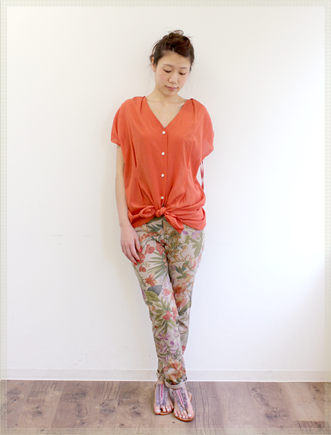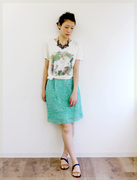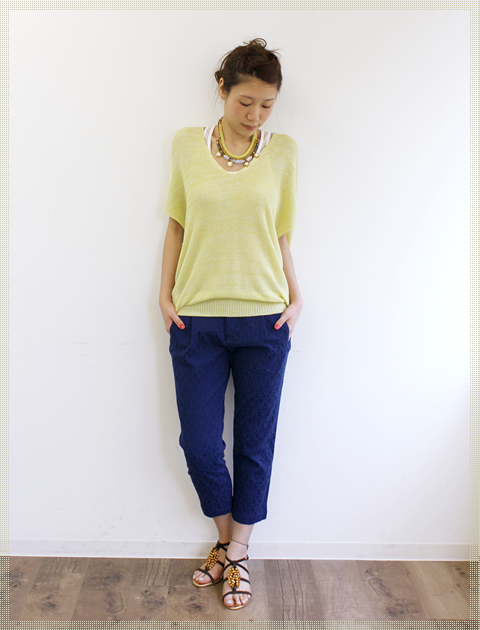 微妙に色合いの違う糸を組み合わせて編み上げた表情のあるニットが主役のスタイル。シックなネイビーのジャガードパンツはトップスとのコントラストがポイントに。胸元には大きめのビジューネックレスで夏気分をプラス。