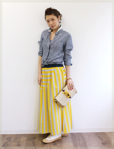 柔らかな素材のマキシスカートはボーダーとストライプを組み合わせた表情のあるデザインが魅力。ベアワンピースにもアレンジ可能なデザインは夏に向けておすすめの1枚。