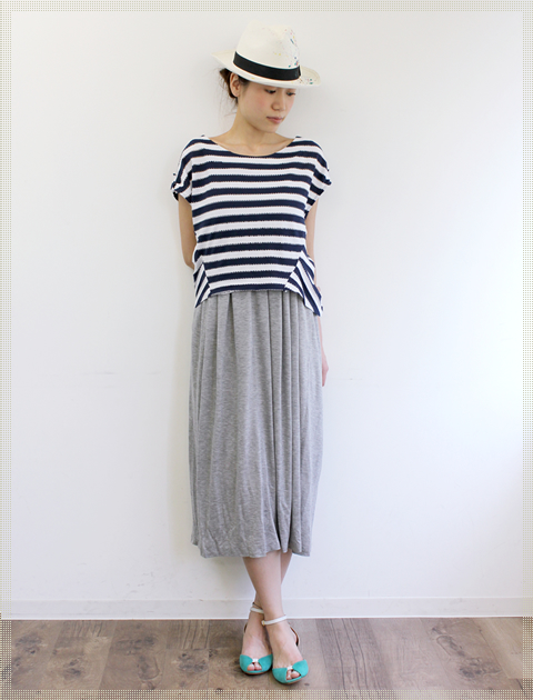 リラックス感のあるジャージワンピースにショート丈のボーダートップスをセットアップした夏らしい1枚。ワンピースとトップスを別々に使えるのはもちろん、ワンピースはマキシスカートにもアレンジ可能な2WAYタイプ。