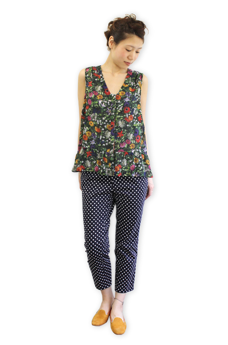 モノトーンのドットが今年らしいプリントパンツ。ストレッチが効いて着心地もラク。カラーアイテムとのコーディネートや、柄×柄の上級コーディネートもトライしやすい。 細身のシルエットで、ゆったりとしたシルエットのトップスとも相性抜群です。
