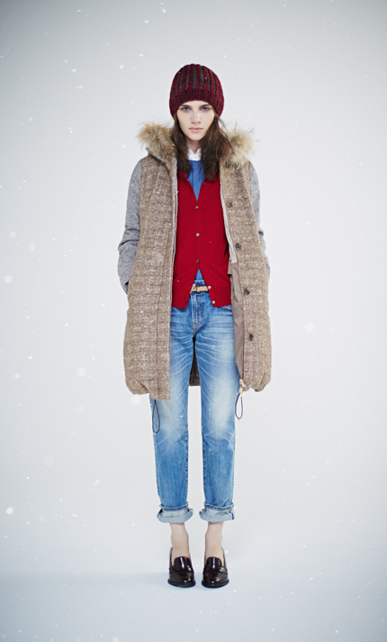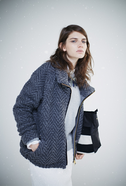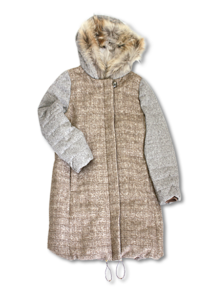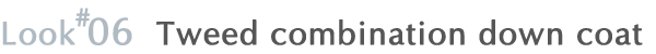 ツイード生地を使用したぬくもりを感じさせるダウンコート。