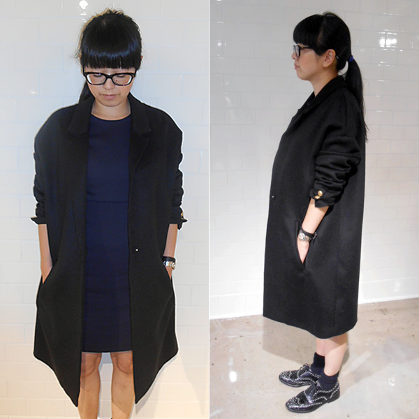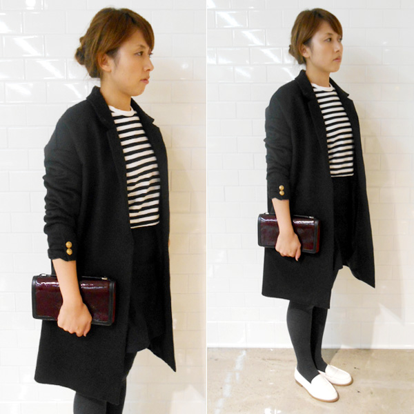 「セリーヌコレクションの様にBIGシルエットのアウターにINはコンパクトシルエットの丈短のボトムスをコーディネイトしました。ブラック×ネイビーで大人の配色がポイント」