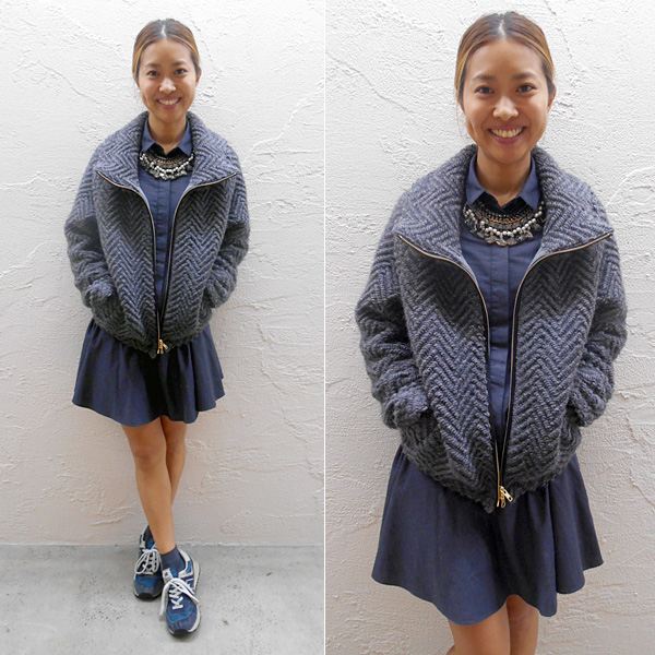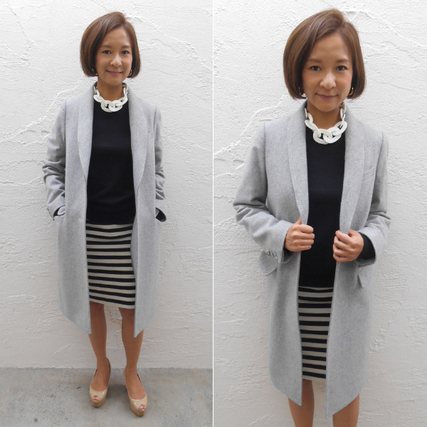 「今年らしくモノトーンコーディネイトにしてみました。足元はグレーのタイツにあえてホワイトのフラットシューズを合わせて、重たくなりがちなOUTERコーディネイトに抜け感を出しました。」