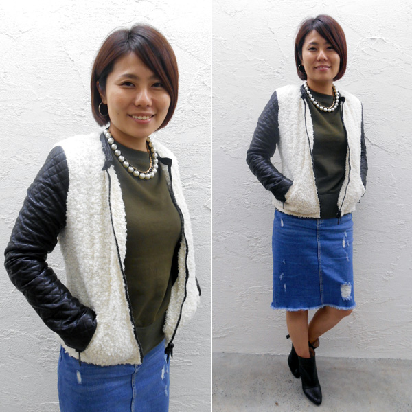 「定番ライダースはお持ちの方が多いかと思いますが、2枚目に買うならワンテクライダースをと思い異素材切替をセレクトしました。コーディネイトは「カジュアル感」+「女らしさ」を表現したく、デニムのタイトスカートをあわせています。」