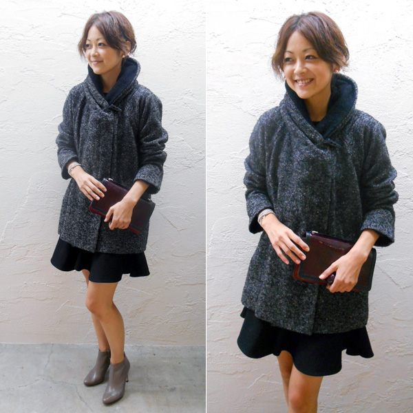 「スカートアイテムがトレンドなのであえてボトムスをみせる丈感のOUTERをセレクトしました。ブラック~グレートーンでもツィードの様な華やぎ素材を使用したアウターはオシャレ感をUPさせてくれます。」