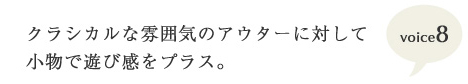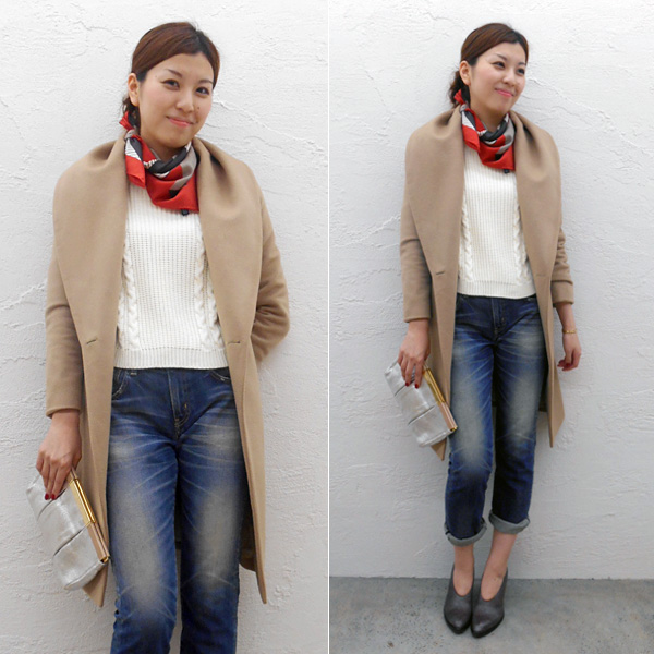 「普段からパンツスタイルが多いので、愛称の良いロング丈のアウターにしました。クラシカルな雰囲気のアウターに対してコートインはシンプルカジュアルにして小物で遊び感をプラス。スカーフでキャメル×レッドの配色にしたり、シャイニー感のあるクラッチあわせが私のお気に入りポイントです。」