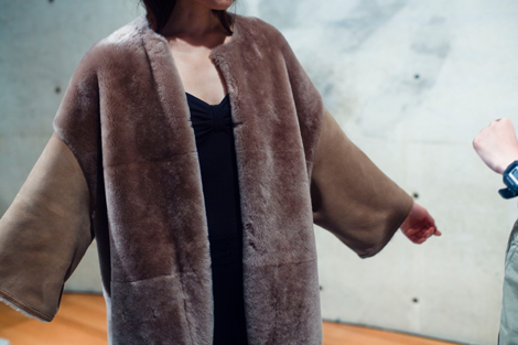 岩崎 そうなんです。今季のラインアップの中でも特に贅沢なアイテムなので、素材にはこだわりました。このムートンはスペイン産なんです。スペインはレザーの生産に強い国で、クオリティもトップレベル。私たちは毎シーズンさまざまな国の素材を手に取りますが、スペインのムートンは表面のキメが細かくて質感もスムース。そのため着た時の印象をエレガントに見せれくれるんです。
